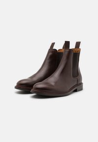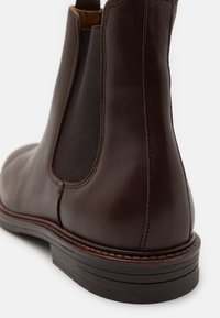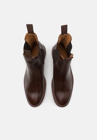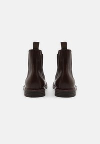 Botte Chelsea en cuir marron avec panneaux latéraux élastiques, bout rond et petit talon empilé. Dotée de languettes à la bordure pour un enfilage facile.