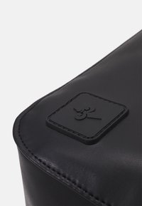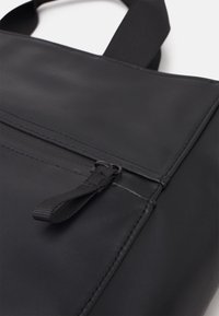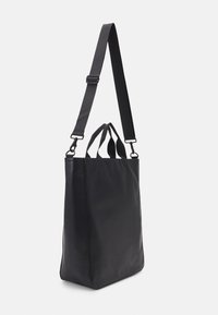 Sac cabas noir en matériau synthétique lisse avec une poche avant zippée, deux poignées supérieures et une bandoulière amovible.