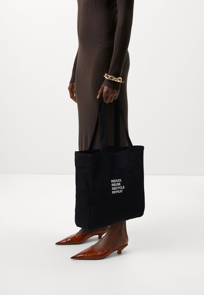 Personne portant une robe marron côtelée et des chaussures pointues marron, tenant un sac fourre-tout noir avec un texte blanc : « RÉDUIRE RÉUTILISER RECYCLER RÉPÉTER. »