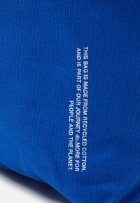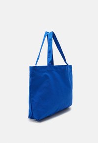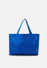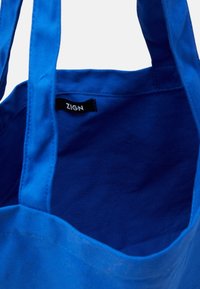 Sac fourre-tout rectangulaire bleu vif avec deux anses, présentant un petit détail imprimé blanc près du coin inférieur droit.