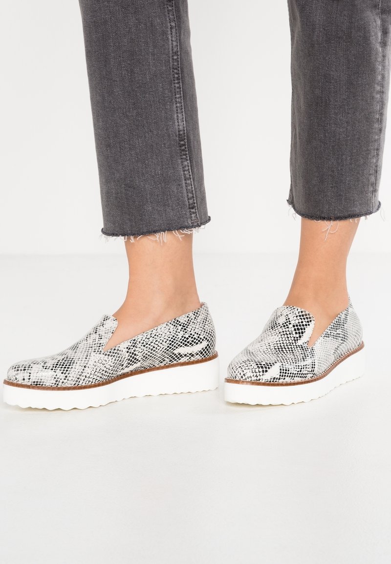 Bottines à enfiler avec un motif serpent en noir et blanc, présentant un dessus texturé et une semelle plateforme blanche avec un bord ondulé.