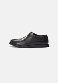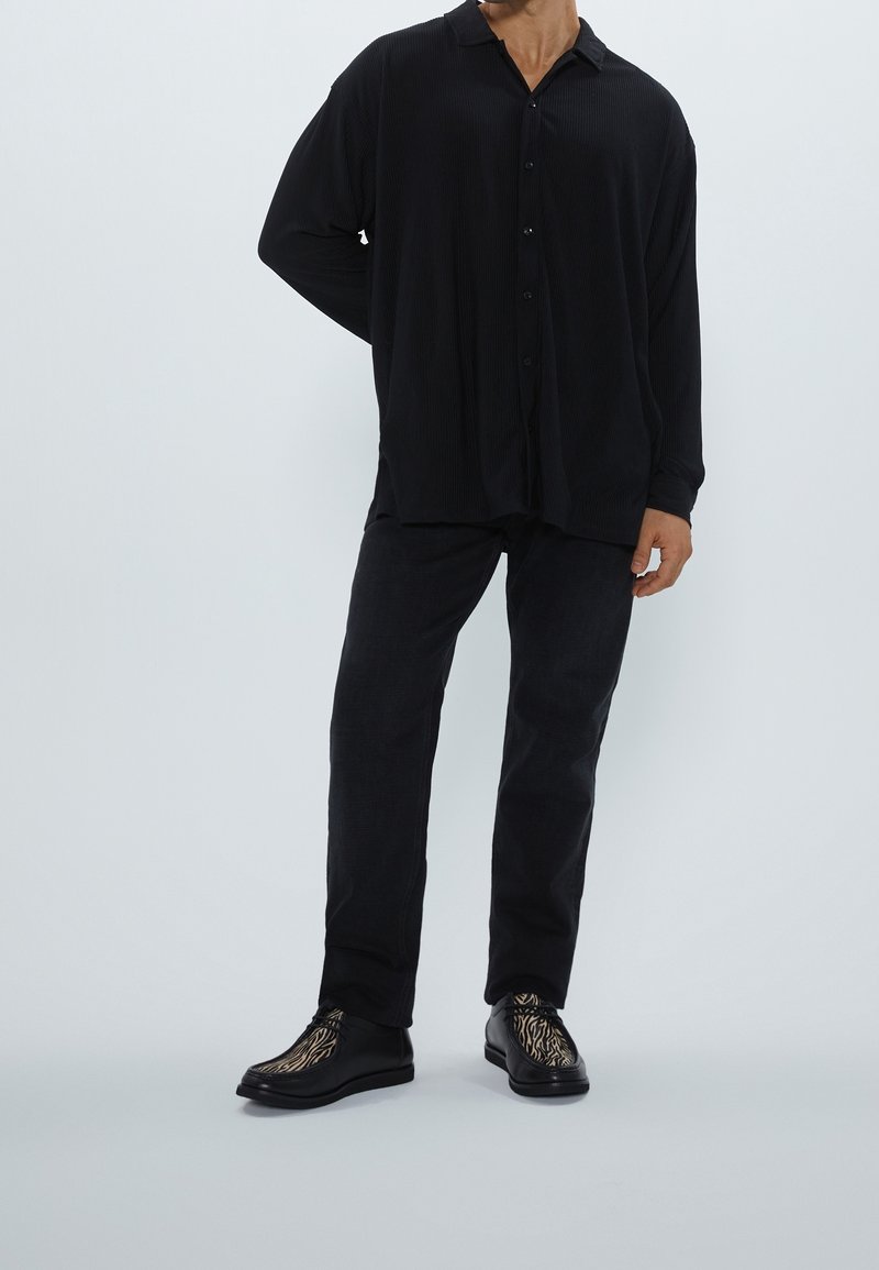 Chemise noire à boutons avec une coupe décontractée et une texture côtelée subtile, associée à un pantalon sombre et des chaussures noires avec un design à rayures dorées.