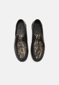 Chemise boutonnée à manches longues noir à côtes, pantalon noir, chaussures noires avec accents en imprimé animal. Texture lisse et coupe décontractée.