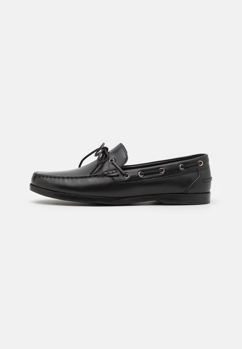 Chaussure de bateau en cuir noir avec un bout arrondi, un laçage décoratif, des œillets en métal et une texture lisse. Semelle basse pour un port décontracté.