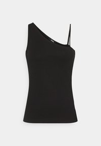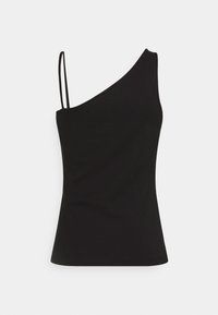 Débardeur noir à une épaule en tissu lisse, présentant une coupe ajustée et une fine bretelle réglable du côté droit.