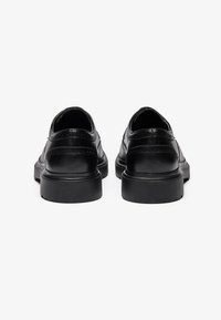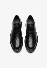 Chaussure habillée en cuir noir avec des détails brogue, bout arrondi et semelle en caoutchouc robuste. Présente un système de laçage et une finition lisse.