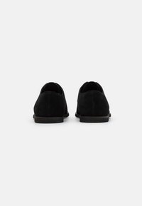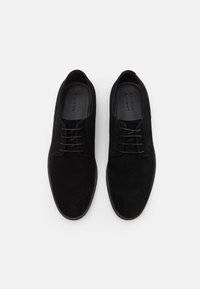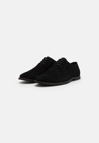 Chaussure habillée à lacets pour homme en daim noir, avec un talon bas et une semelle lisse, vue de profil sur fond blanc.