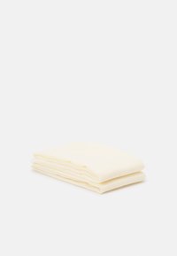 Écharpe en tissu plié de couleur crème avec une texture douce et des bords légèrement effilochés sur un fond blanc uni.