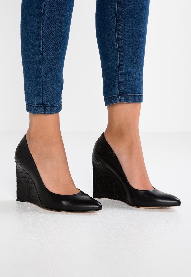 Chaussures à talons hauts en cuir noir avec des pointes effilées, des découpes sur les côtés et des accents texturés près du talon.