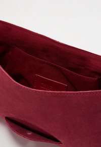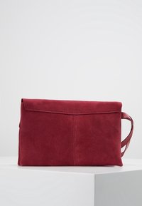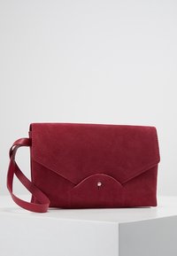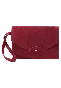 Pochette en daim rouge avec fermeture à rabat, accents arrondis et un bouton-pression argenté décoratif. Comprend une bandoulière amovible.