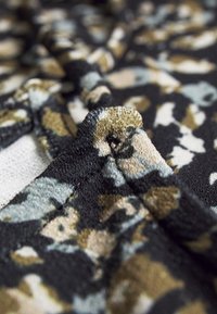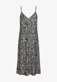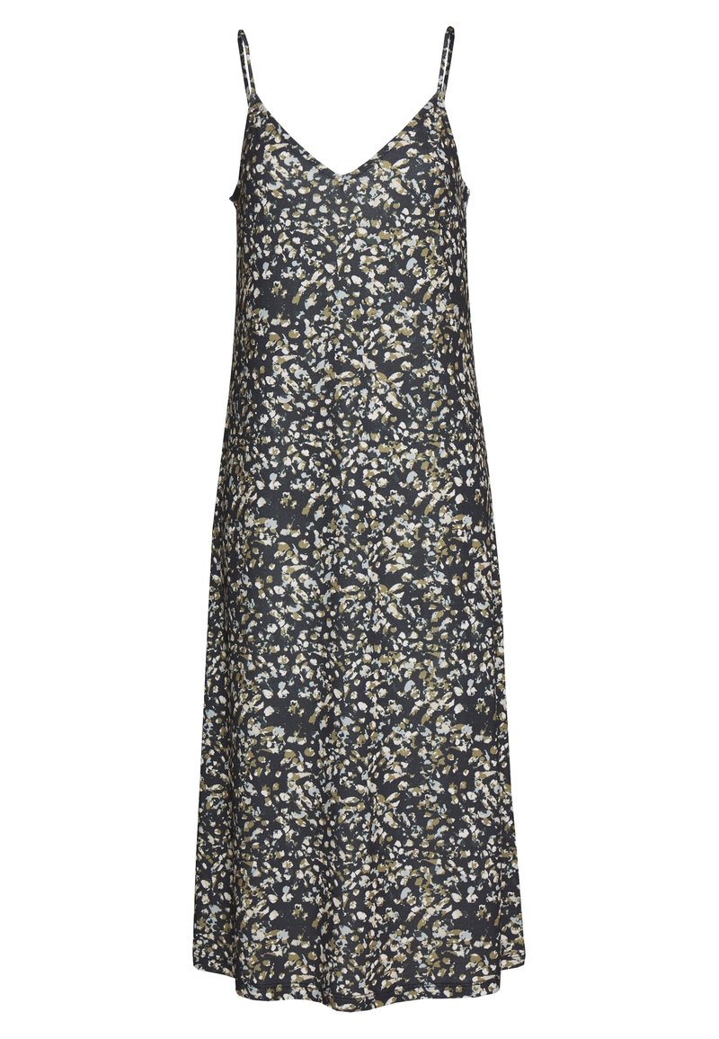 Robe d'été florale avec des bretelles spaghetti, présentant un fond sombre et un mélange de motifs blancs et vert olive, fabriquée en tissu léger.