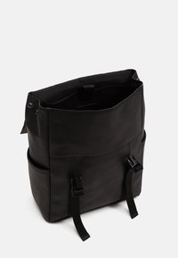 Sac à dos noir avec un extérieur en cuir lisse, fermeture à rabat, deux poches latérales et des bretelles réglables, présentant des détails de design minimalistes.