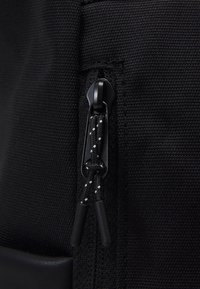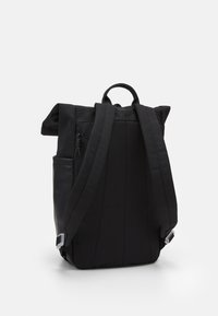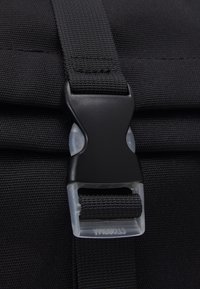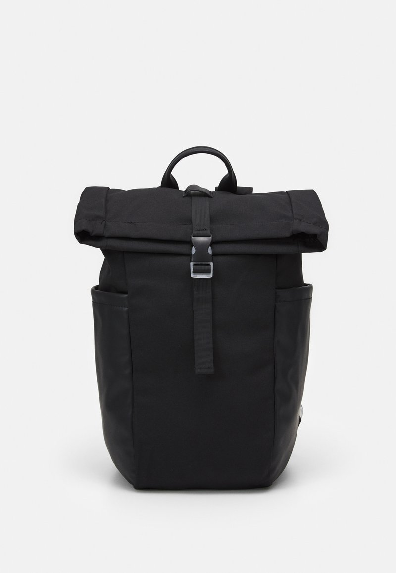 Sac à dos noir avec un design à rabat enroulable, fabriqué en tissu avec des accents en cuir, doté d'une fermeture à sangle frontale et de poches latérales.