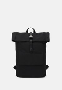 Sac à dos noir à fermeture roulante, poche avant et fermeture à bride avec boucle, avec poignée supérieure et bretelles ajustables.