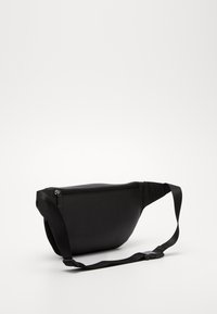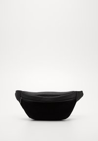 Sac banane noir fabriqué en cuir texturé et en daim, avec une fermeture à glissière supérieure et une forme ovale dotée d'une large sangle.
