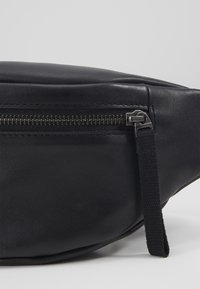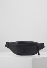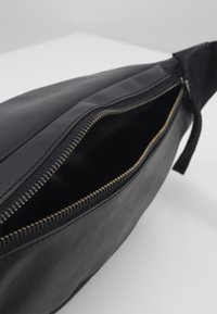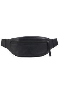 Banane en cuir noir à texture lisse, forme ovale, avec une poche avant zippée. Équipée de sangles réglables de chaque côté.