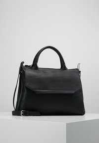 Sac à main en cuir noir au design structuré, doté d'une poignée supérieure, d'une bandoulière réglable et d'une poche à rabat avant. Texture lisse.