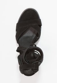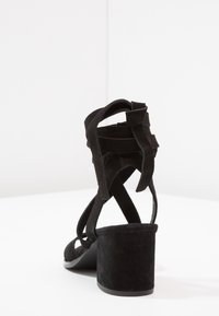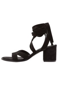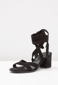 Des sandales à talons en suède noir présentent un design à lanières avec des liens à la cheville. Les talons sont en forme de bloc, offrant stabilité et soutien.