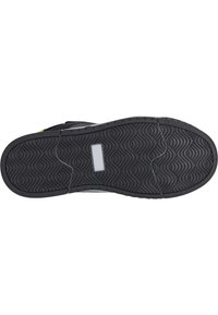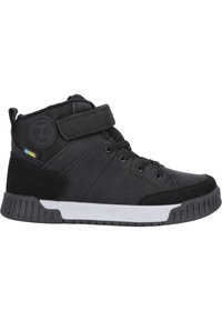 Baskets montantes noires avec un mélange de matériaux lisses et texturés, dotées d'une sangle en Velcro, d'un logo rond et d'une semelle en caoutchouc blanche.