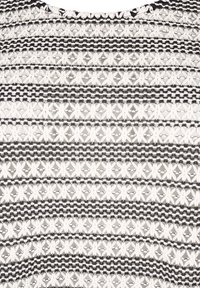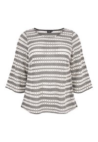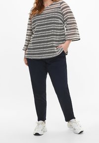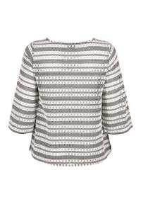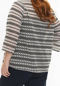 Femme portant un haut à manches longues rayé noir et blanc à motifs floraux, les mains dans les poches d'un pantalon sombre, cheveux partiellement visibles.