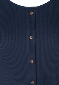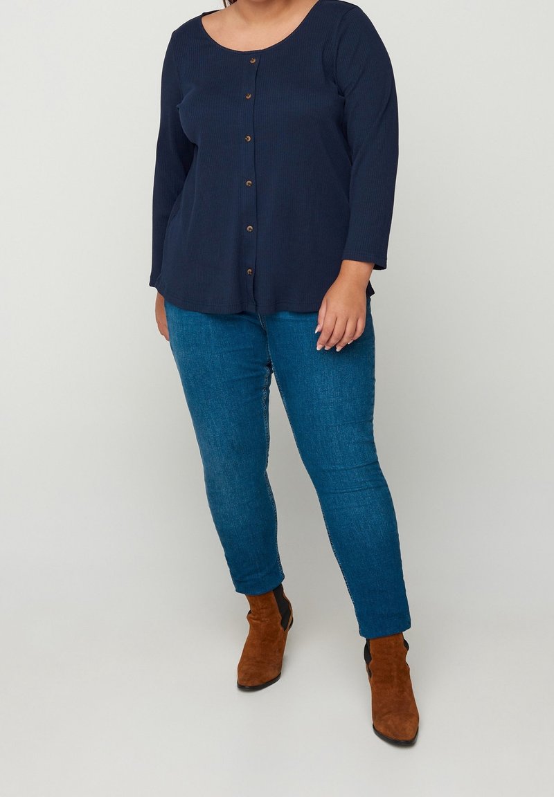 Haut à manches longues côtelé bleu marine avec un col rond et des boutons à l'avant. Associé à un jean skinny bleu et des bottines brunes.