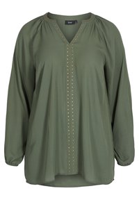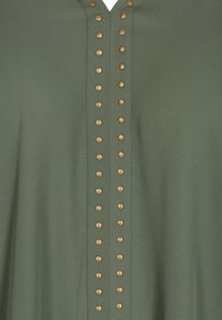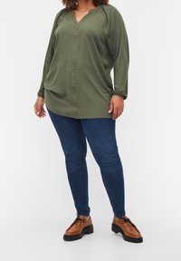 Femme aux formes portant un chemisier vert olive à manches longues avec des clous en bronze le long de l'encolure en V et du centre avant, associé à un jean bleu foncé.