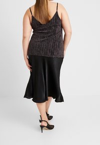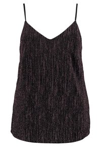 Haut noir sans manches avec un col en V, présentant une surface texturée et scintillante avec de fines rayures verticales. Bretelles ajustables incluses.