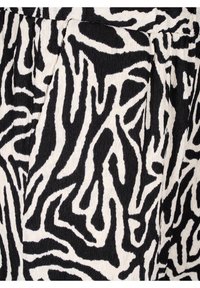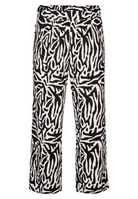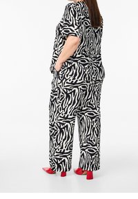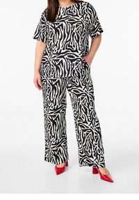 Femme portant un haut à manches courtes avec un imprimé abstrait noir et blanc et un pantalon large, associé à des chaussures à talons blocs pointues rouges.