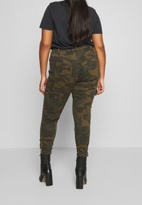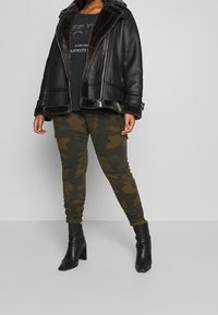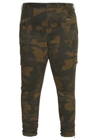 Personne portant un pantalon cargo camouflage vert et marron avec des poches latérales et des bottines à talons noires.