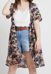 Veste kimono florale noire avec des fleurs roses, violettes et blanches. Tissu léger, manches courtes, ouverture sur le devant, portée sur un haut blanc et un short en jean.