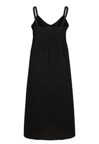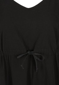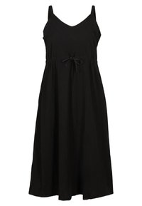 Robe noire avec décolleté en V, fines bretelles et taille à cordon. Fabriquée en tissu léger, elle présente une jupe évasée.