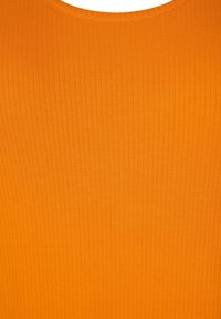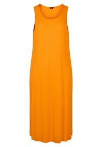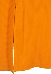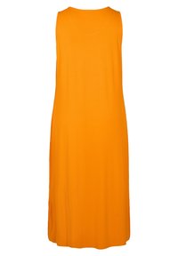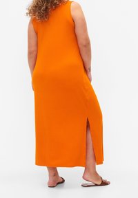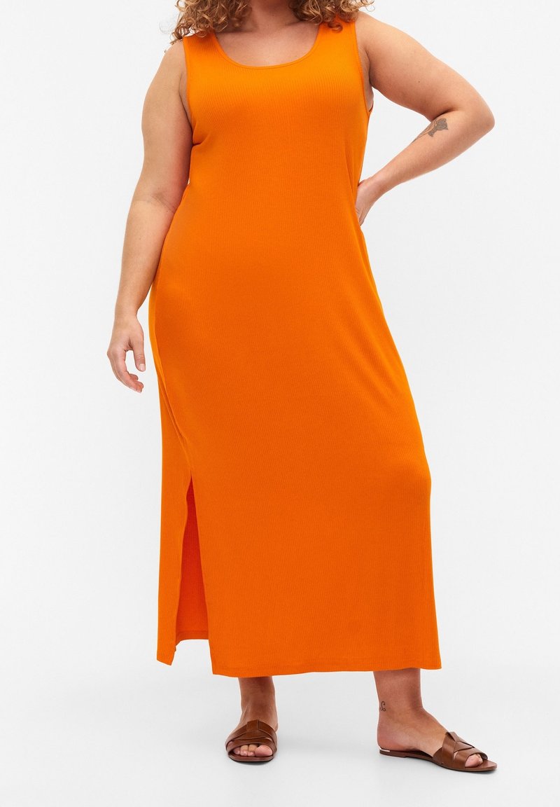 Femme portant une robe longue orange sans manches avec une fente latérale, des sandales plates marron, main sur la hanche, et des tatouages visibles sur le bras et la cheville.
