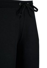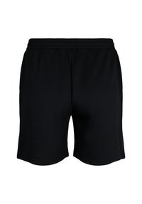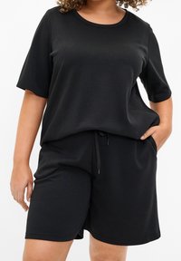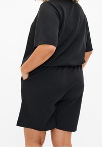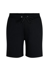 Shorts en coton noir avec taille élastique, cordon de serrage et poches latérales. Texture lisse, longueur jusqu'aux genoux, design décontracté.