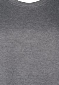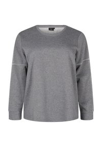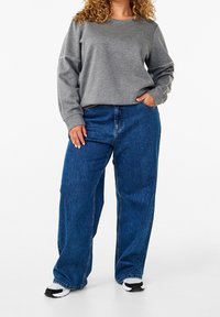Femme aux cheveux bouclés portant un pull gris à manches longues avec des détails de couture blanche et un jean en denim bleu, main posée sur la hanche.